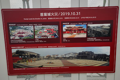 火災前に行った首里城の写真と、火災後はこのようなパネルが工事の衝立に展示してありました。こうして見ると、火災前の首里城はとても美しいですね。