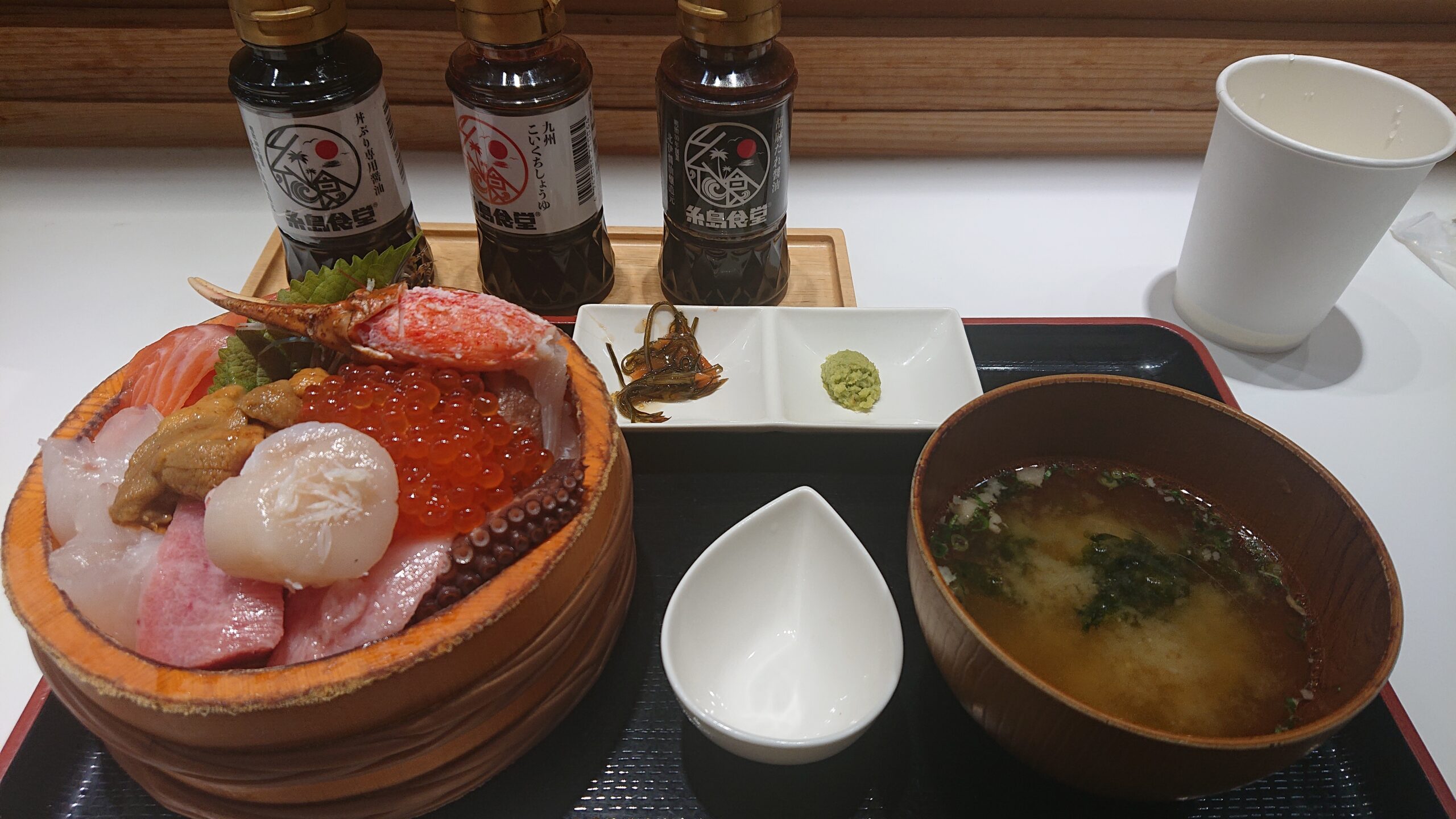 博多到着後はレンタカーを借りて糸島方面へ向かい、お昼に「糸島食堂本店」にて新鮮な魚介もりもりの海鮮丼をいただきました。種類豊富で、一切れずつどの刺身も分厚くトロなどは口の中で、まさにトロけてしまいました☺お店独自の刺身醤油が九州らしく少し甘めで、とろみがありこれまた美味しくお土産にオリジナルの醤油も購入してしまいました。