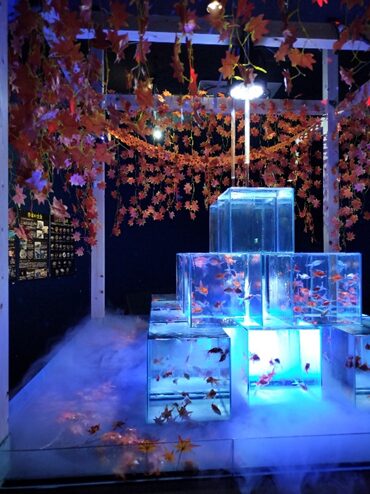 他にも秋のイベントで金魚展が行われており、とても幻想的な空間で金魚が展示されていました。