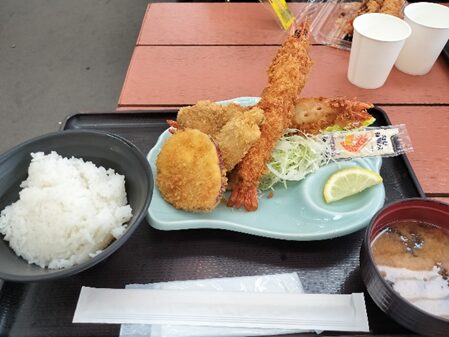お昼は魚太朗にてオオエビと地魚の定食を食べました。目の前に定食が届いた時はオオエビの大きさに目を引きました。衣もサクサクしていて身がプリプリで美味しかったです。