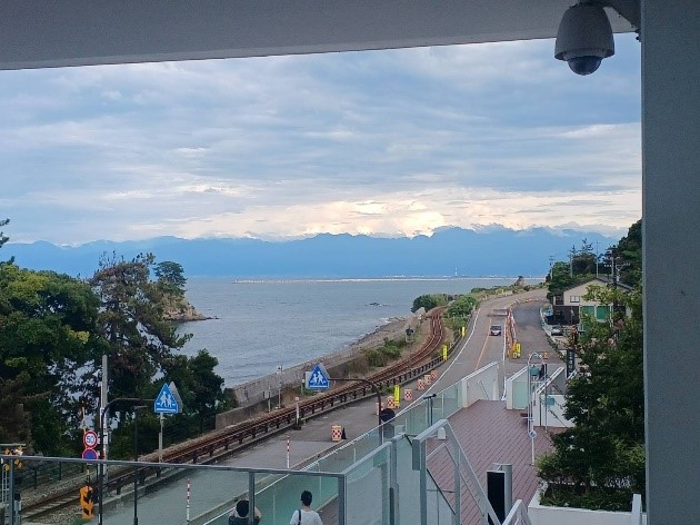 高台に位置する為、美しい立山連峰と海の景色が眺められ、撮影スポットになり、ほとんどの利用者がカメラを向けて撮影していました。