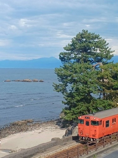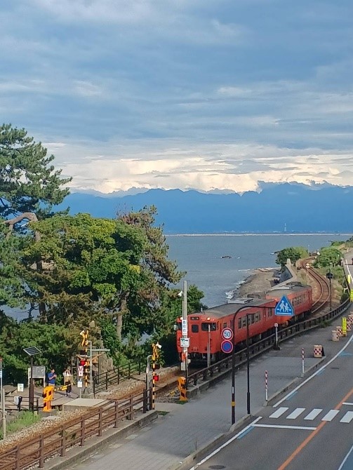 そこにタイミング良く、線路にJR氷見線の列車が来ると、さらに良い景色となります。
