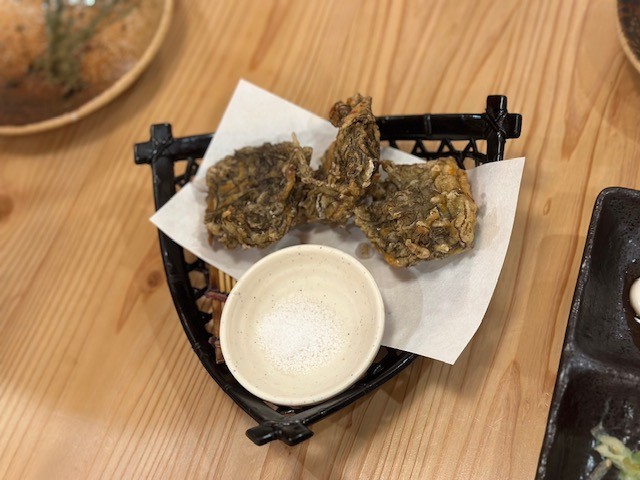 もずくの天ぷらは岩塩を付けて食べると絶品!