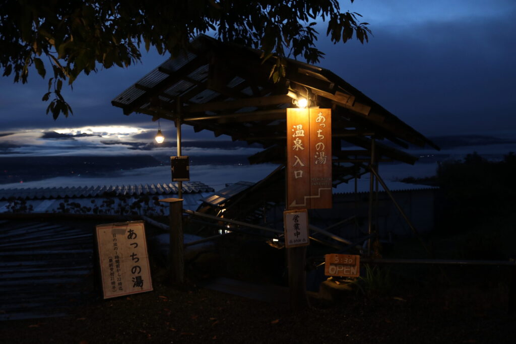 日の出の1時間前から夜まで営業しており、温泉に入りながら日の出や日の入りが眺められる他、甲府盆地を望む雄大な景色や、日の入り後は夜景も楽しむことができます。せっかくなので日の出+富士山を見たかったので、車で深夜に出発して日の出前に現地に到着しました。
