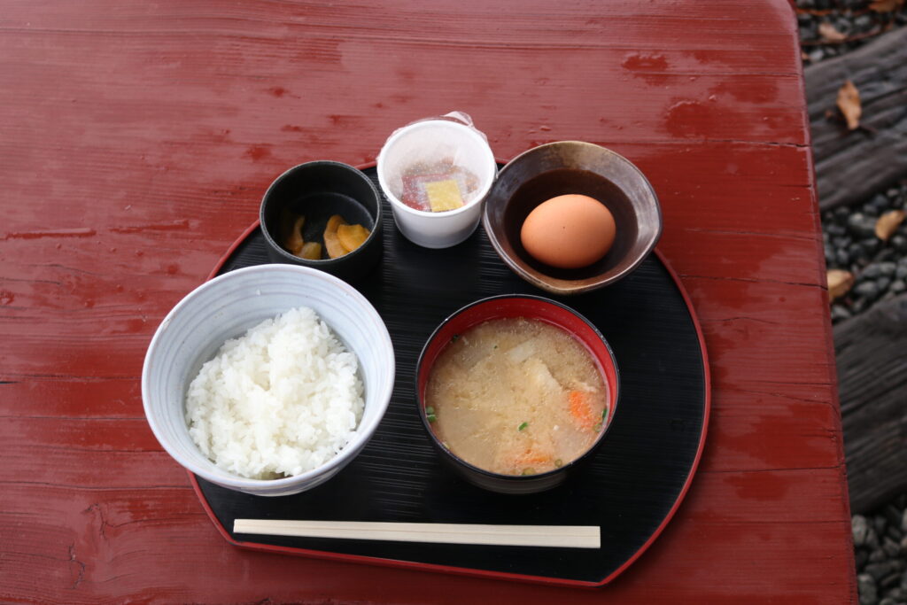 朝食限定で販売される卵かけごはん!地元産の卵は濃厚で、雲海を眺めながらの朝食は夜通し運転してきた疲れも吹き飛ばしました。