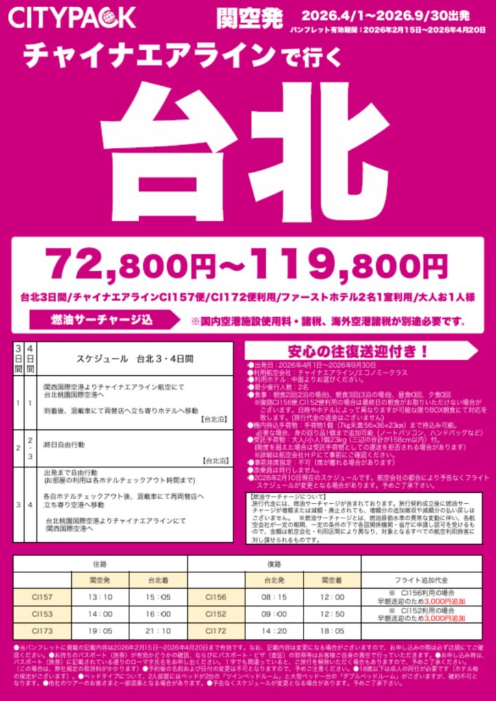 当社では海外旅行商品を中心に自社企画「海外:CITYPACK」「国内:シティパック」として旅行パンフレット商品の造成をしております。パンフレット商品にあてはまらない場合でも「海外:CITYPACKセレクト」「国内:シティパックセレクト」として豊富な仕入れ先様との取引を強みに、ご希望に合う旅行商品を造成しております。