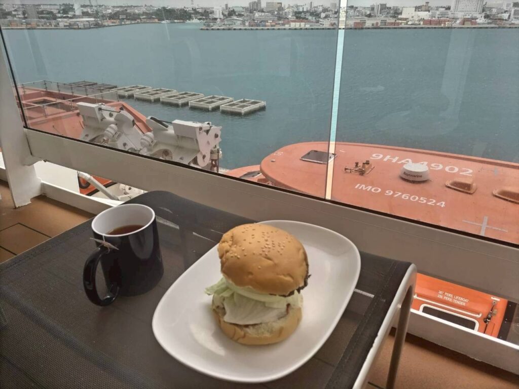 しょっちゅうバイキング会場から食べ物を持ってきてバルコニーで食べていました。
